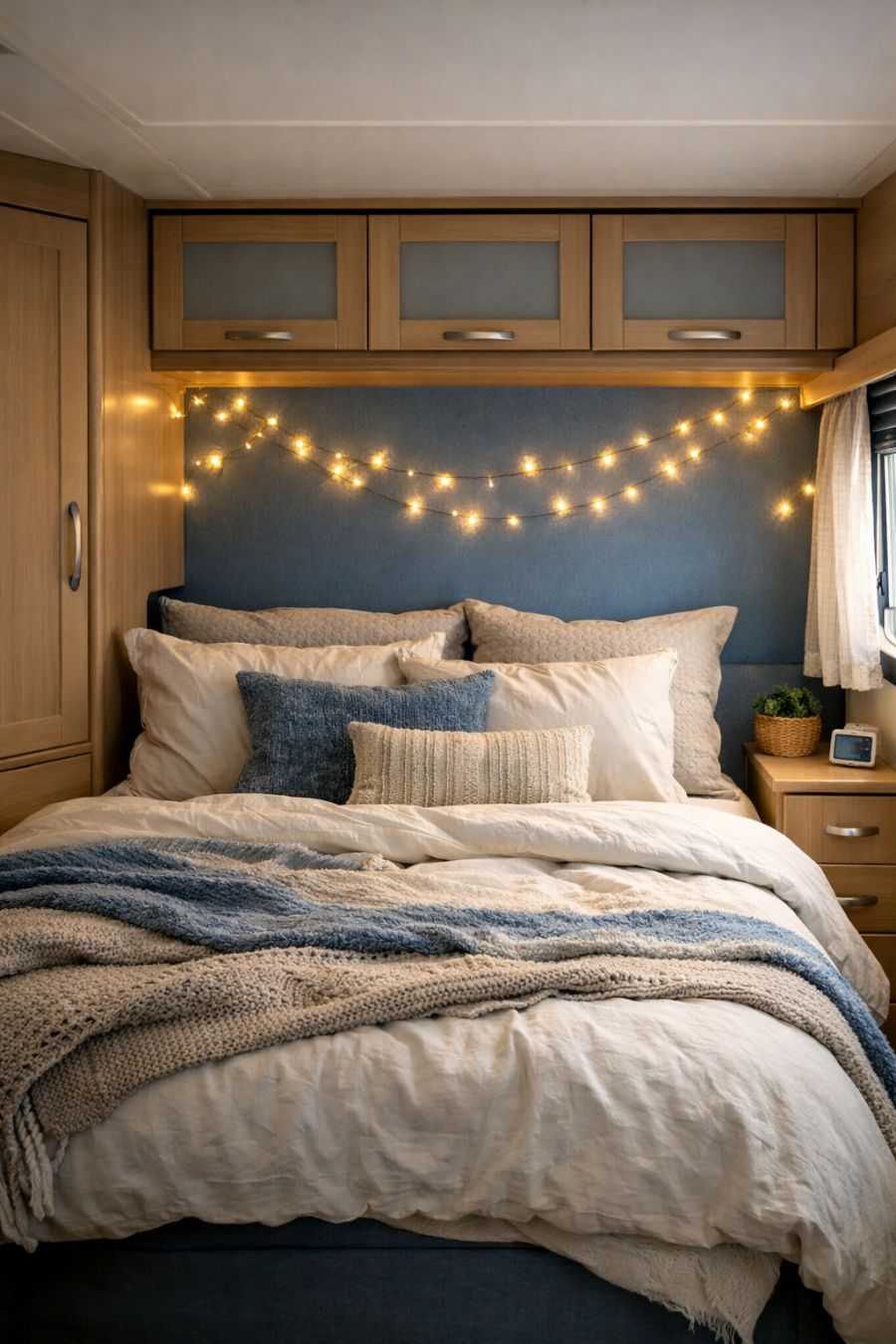 The bedroom is a serene retreat, designed to offer the ultimate in comfort and coziness. A plush double bed, dressed in layers of soft linens and textured throws, invites restful nights and lazy mornings. The walls are painted in a calming shade of blue, echoing the exterior and creating a sense of continuity and peace. Above the bed, a series of fairy lights twinkle softly, adding a touch of magic and warmth to the space. A small wardrobe and a built-in drawer system provide ample storage, ensuring everything has its place.