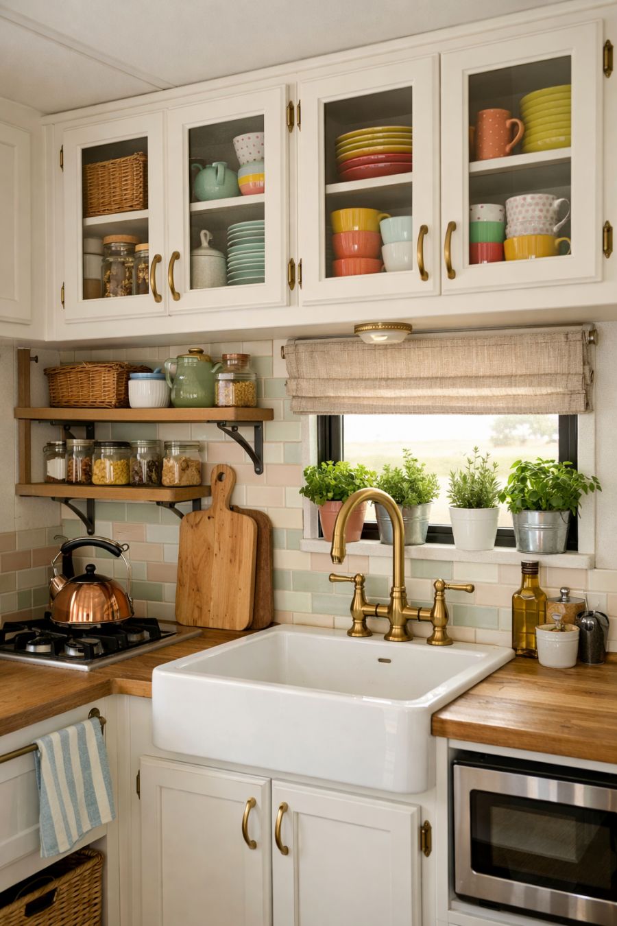 The kitchen area, though small, is a model of efficiency and style, boasting a harmonious blend of vintage and modern elements. White cabinets with glass fronts display an array of colorful dishware, adding a playful splash of color against the soft pastel backsplash. A compact butler's sink, paired with brass fixtures, provides a nod to classic design while maintaining practicality. Open shelving offers easy access to essentials, while potted herbs on the windowsill add freshness and a pop of greenery.