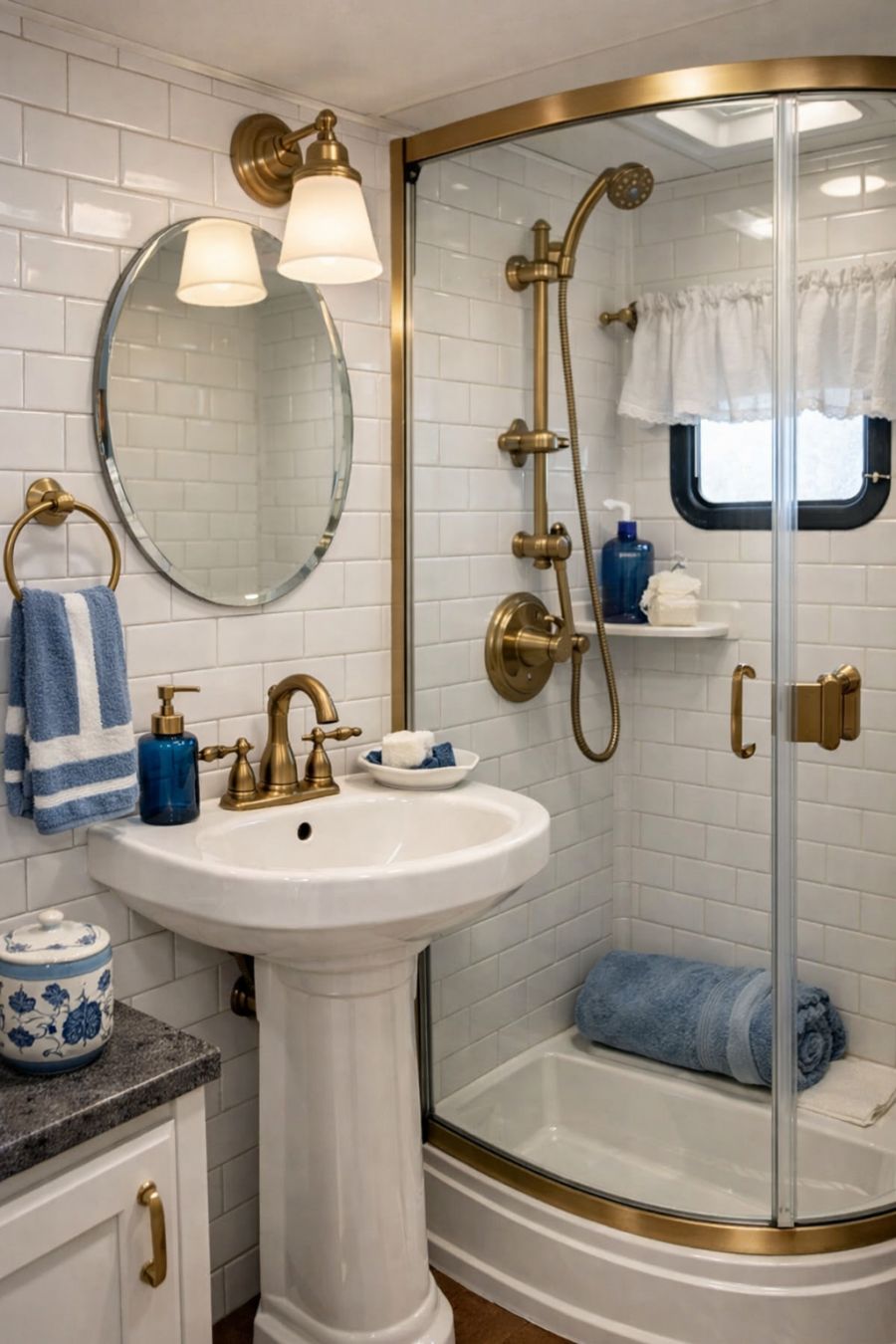 The bathroom is a testament to efficient design, offering both style and functionality in its compact space. Walls are clad in white subway tiles, which reflect light and create an airy, open feel. A pedestal sink, paired with vintage-inspired brass fixtures, adds a touch of elegance to the space. The shower area is enclosed with clear glass, making the room feel larger and more open. Accessories in shades of blue and white tie the space together, maintaining the whimsical theme of the camper.
