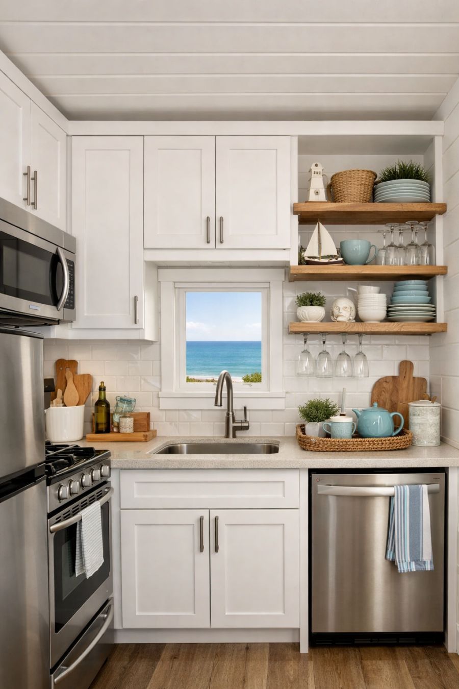 The kitchen, though petite, is a marvel of efficient design, wrapped in white cabinetry that enhances the sense of space and cleanliness. Sleek countertops provide ample room for meal preparation, while open shelving displays a curated selection of crockery and coastal-themed decor. Stainless steel appliances add a modern touch, and a small window above the sink offers a glimpse of the sea, making everyday tasks a pleasure. The overall aesthetic is one of understated elegance, with functionality at its core.
