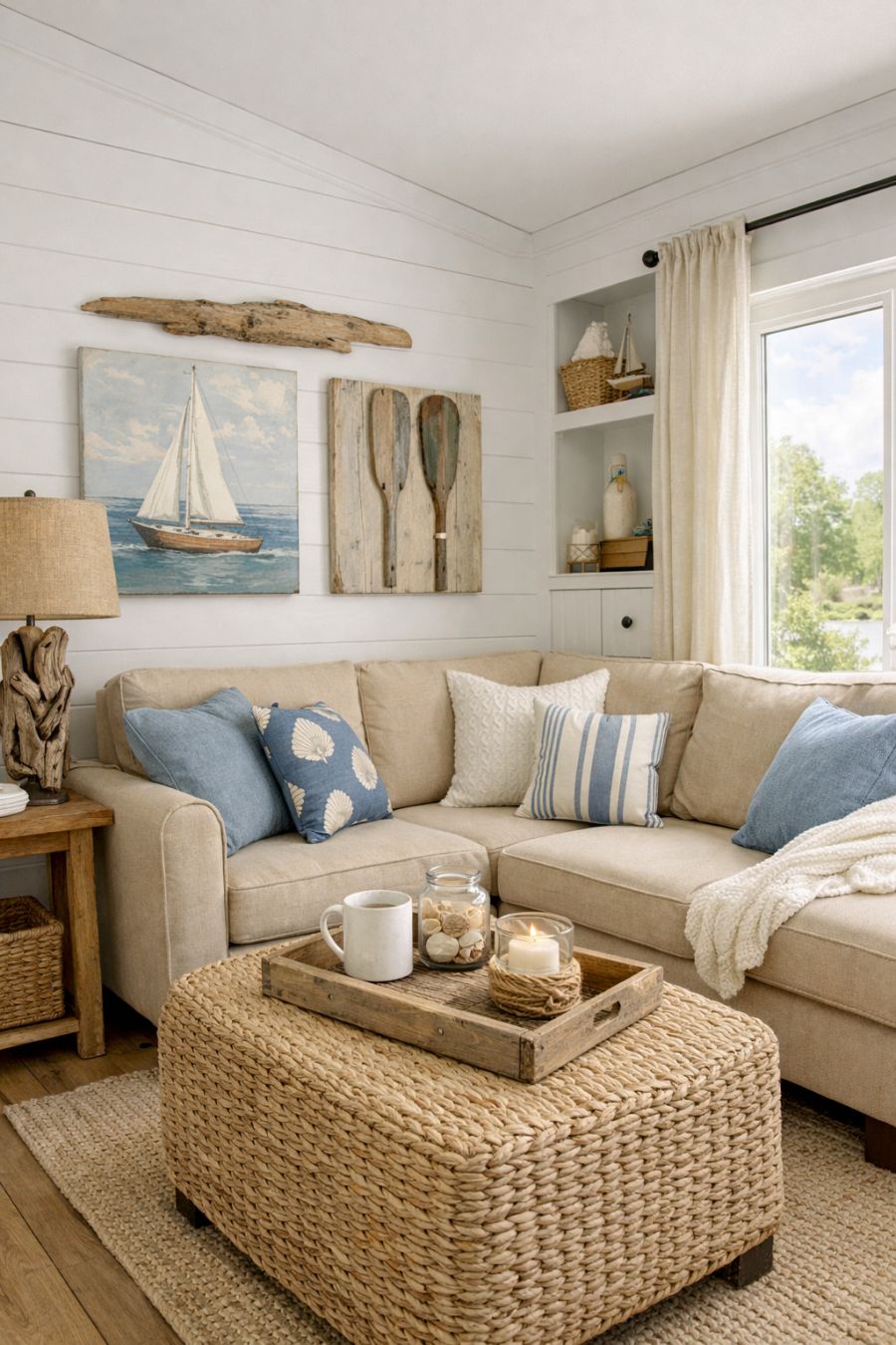 Step inside the living area, where the decor exudes a cozy seaside charm. The space is thoughtfully designed to make the most of its compact size, utilizing light, airy colors and natural textures to create a sense of openness. Soft, sand-colored sofas are adorned with cushions in ocean blues and whites, providing a comfortable spot to relax. Nautical-themed artwork and driftwood accents add character, while large windows ensure the room is bathed in natural light, enhancing the connection to the outdoor landscape.