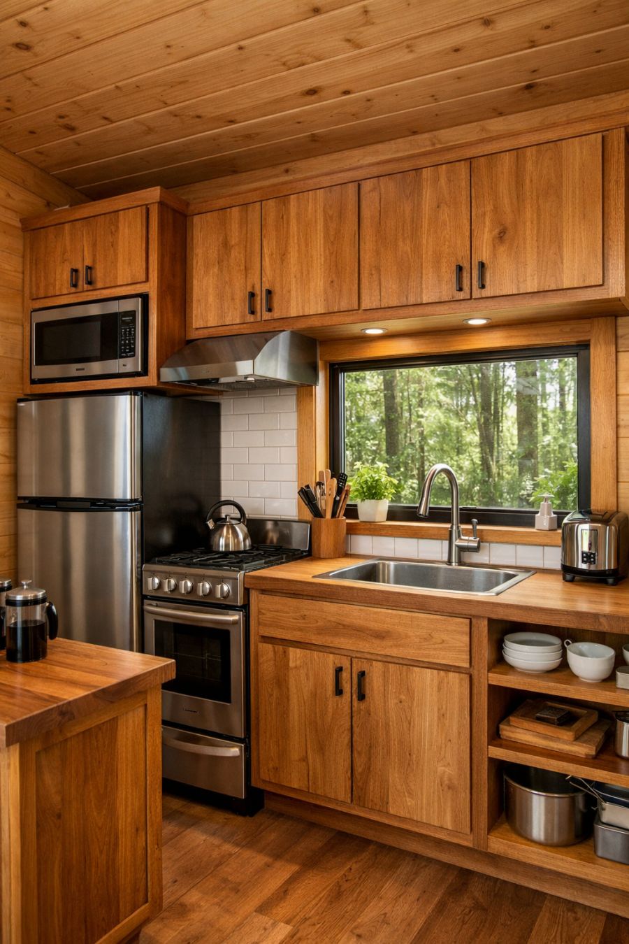 The kitchen area is a marvel of modern design, packing all the necessities into a cleverly organized space. Custom cabinetry, crafted from the same natural timber as the rest of the home, provides ample storage and maintains the cohesive aesthetic. Stainless steel appliances add a contemporary touch, while a compact yet efficient layout ensures everything is within easy reach. A large window above the sink brings in natural light and offers a glimpse of the forest beyond, making even the simplest of chores feel like a treat. The kitchen is a testament to the idea that small spaces can be both functional and stylish.