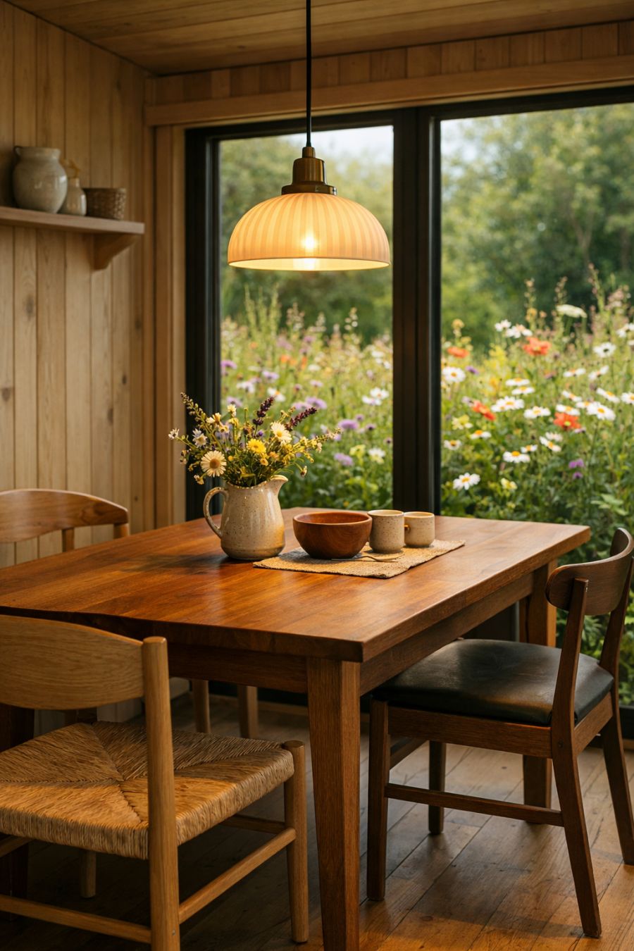 The dining area, though compact, is a masterclass in efficient design. A sleek, wooden dining table serves as the centerpiece, surrounded by simple yet elegant chairs that underscore the home's natural aesthetic. The space is illuminated by a pendant light that casts a warm, inviting glow, creating the perfect ambiance for intimate meals. Large windows continue the theme of bringing the outdoors in, offering diners a picturesque view of the wildflower garden just beyond the walls. The overall design is both functional and beautiful, making every meal feel like a special occasion.