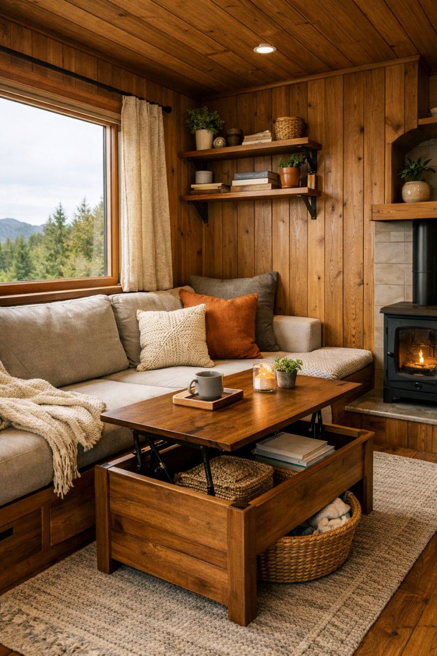 Stepping inside, the living area is a cozy haven that immediately envelops you in warmth and comfort. The walls are adorned with rich timber paneling that complements the natural light streaming in from large windows, offering unobstructed views of the surrounding landscape. Plush seating invites relaxation, while minimalist decor creates a sense of spaciousness despite the compact size. The design seamlessly blends form and function, with smart storage solutions and multifunctional furniture enhancing the practicality of the space.