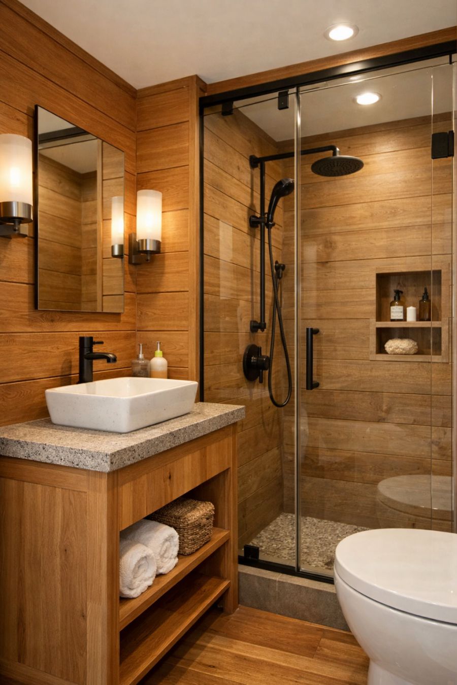 The bathroom is a study in efficient design, featuring natural materials that echo the home's overall aesthetic. The walls are clad in sleek, water-resistant wood paneling that adds warmth and texture to the space. A compact vanity with a stone countertop provides both style and practicality, while a glass-enclosed shower makes the most of the limited square footage. Subtle lighting fixtures and a neutral color scheme enhance the bathroom's serene and calming atmosphere, making it a perfect space for relaxation and rejuvenation.