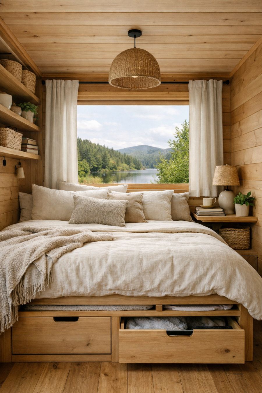 The bedroom area is a tranquil retreat, designed with rest and relaxation in mind. The use of natural materials continues with timber walls and a soft, neutral color palette that creates a soothing atmosphere. A large window serves as a focal point, framing the serene view outside and providing a connection to nature from the comfort of bed. Clever storage solutions, such as built-in shelves and under-bed drawers, maximize the use of space without sacrificing style. The overall design is minimalist yet warm, encouraging a restful night's sleep.
