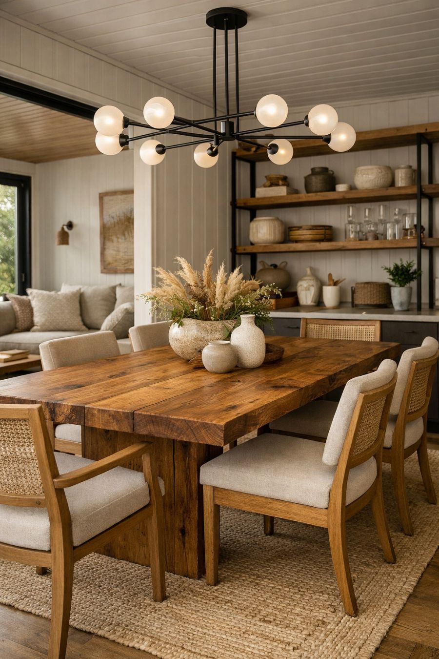 The dining area is a seamless extension of the living space, designed to accommodate both intimate family meals and larger gatherings. A handcrafted wooden dining table serves as the centerpiece, surrounded by elegant chairs that provide comfort and style. Above the table hangs a modern chandelier, adding a touch of sophistication to the space. The open layout allows for effortless flow and conversation, making it the perfect setting for entertaining guests or enjoying a quiet dinner. The neutral tones and natural materials used in the decor create a harmonious and inviting environment.