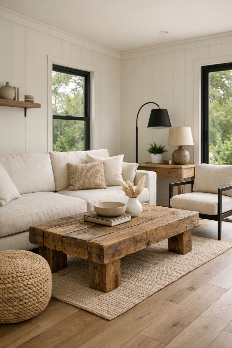 Stepping inside, the open floor plan immediately captures your attention. The living area is designed with minimalistic elegance, featuring clean lines and a neutral color palette. Soft cream-colored walls complement the light wooden flooring, creating a cohesive and airy atmosphere. A combination of modern and rustic furnishings, including a plush sofa and reclaimed wood coffee table, invite relaxation and conversation. Large windows allow natural light to flood the space, enhancing the connection between the interior and the serene outdoor surroundings.