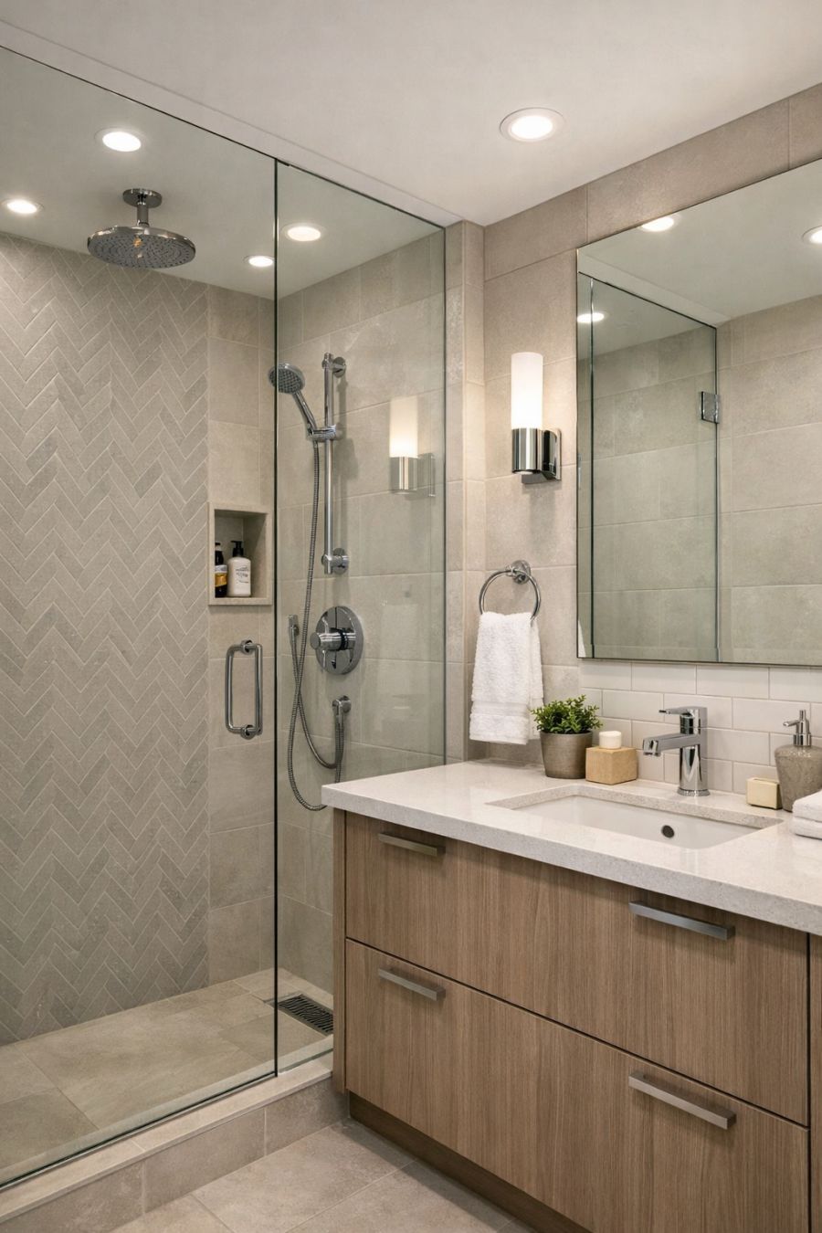 The bathroom is designed with an emphasis on style and functionality, featuring modern fixtures and a soothing color scheme. The walls are adorned with elegant tiles in soft, neutral shades, creating a clean and inviting atmosphere. A spacious glass-enclosed shower offers a luxurious experience, while the sleek vanity provides ample storage for toiletries. The polished chrome fixtures add a touch of modernity, and the strategically placed lighting ensures that the space is well-lit and welcoming. Overall, the bathroom is a serene retreat that combines practicality with elegant design.