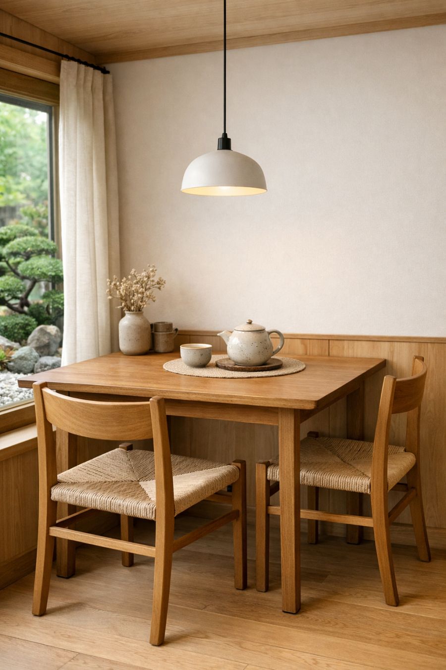 The dining area continues the theme of understated elegance, featuring a compact yet beautifully crafted wooden dining table and chairs that echo the home's minimalist philosophy. Positioned near a window, diners can enjoy meals bathed in natural light, with views of the bonsai garden enhancing the dining experience. The simplicity of the design is accentuated by the use of neutral tones and organic materials, which together create a soothing environment conducive to mindful dining. A single pendant light hangs above the table, providing gentle illumination and contributing to the tranquil atmosphere.