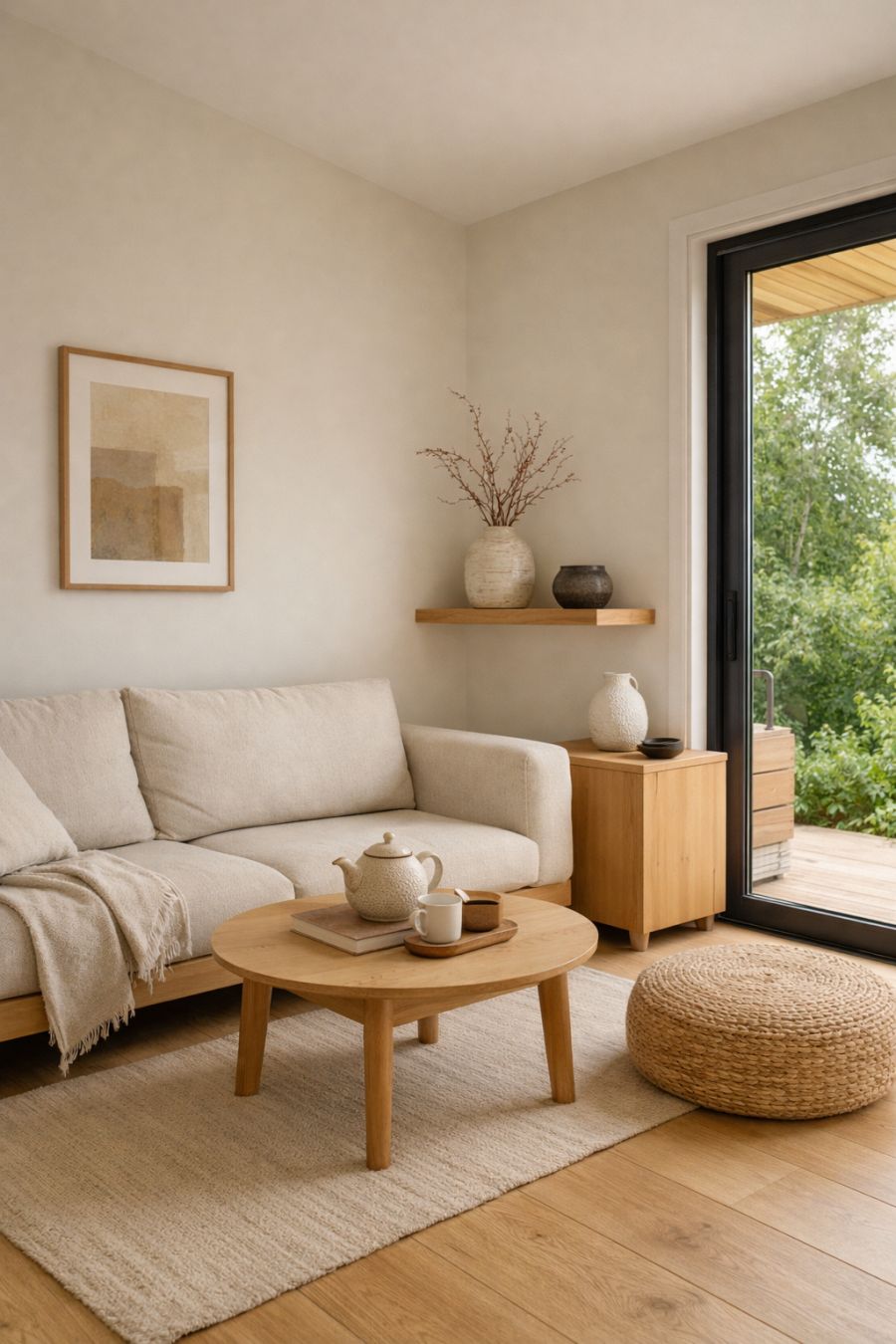 Stepping inside, the living area is a sanctuary of minimalist luxury, where every element has been carefully chosen to enhance the sense of calm. The walls are unadorned, painted in a soft, natural hue that complements the warm tones of the light wood flooring. Simple yet elegant furniture pieces, such as a low-profile sofa and a small coffee table, invite relaxation without overwhelming the space. Natural light pours in through large windows, illuminating the room and creating a seamless connection with the outdoors, while a few select pieces of art and pottery add subtle character and depth.