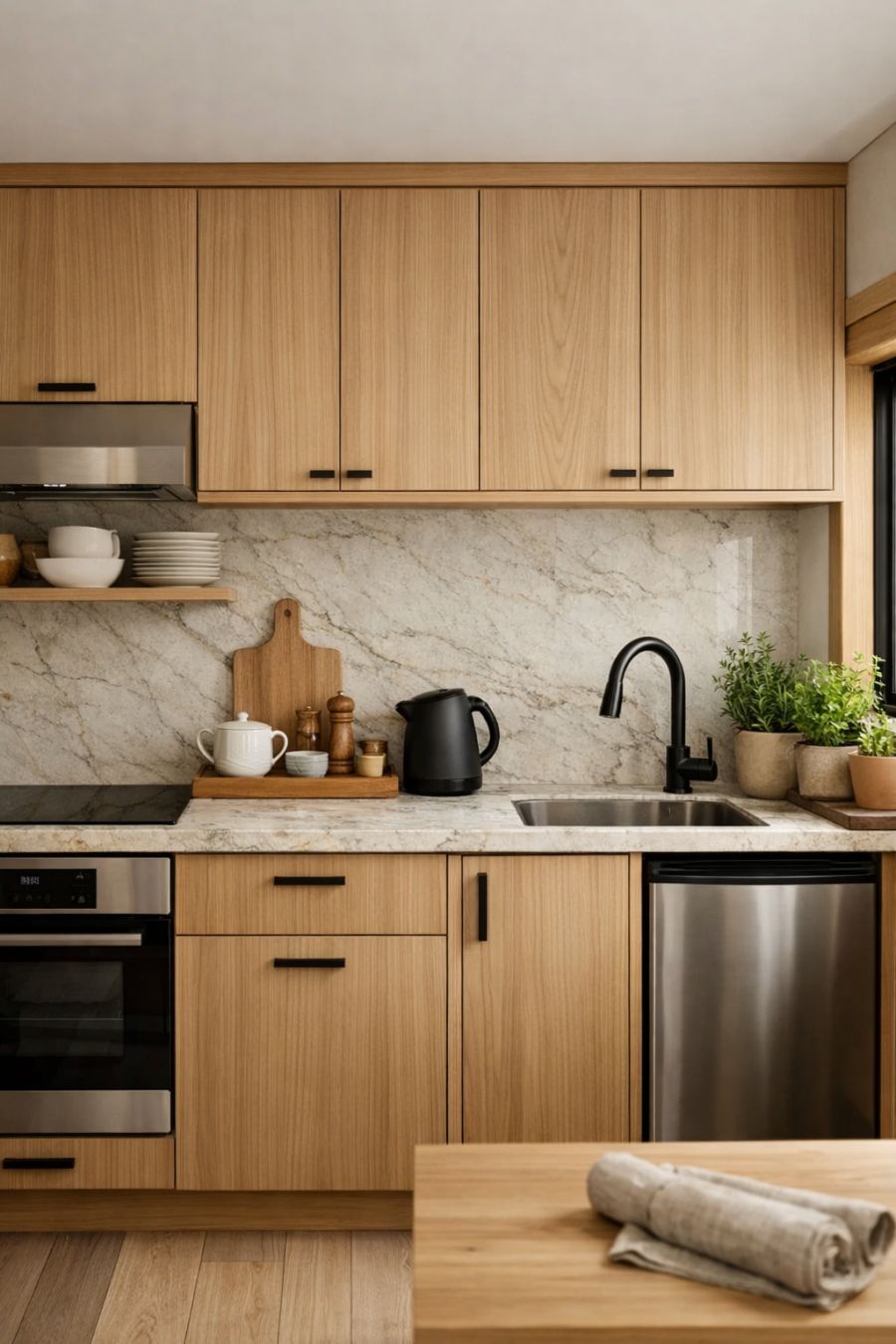 In the kitchen, functionality and style converge in a space that is both compact and efficient. Clean lines and uncluttered surfaces define the area, with cabinetry in light wood tones reflecting the Japandi aesthetic. The countertops, crafted from natural stone, offer ample workspace while maintaining the minimalist ethos. Modern appliances are seamlessly integrated into the design, ensuring that the kitchen remains as practical as it is beautiful. Subtle details, such as hand-crafted ceramic dishware and a small herb garden on the windowsill, add personality and warmth to the space.
