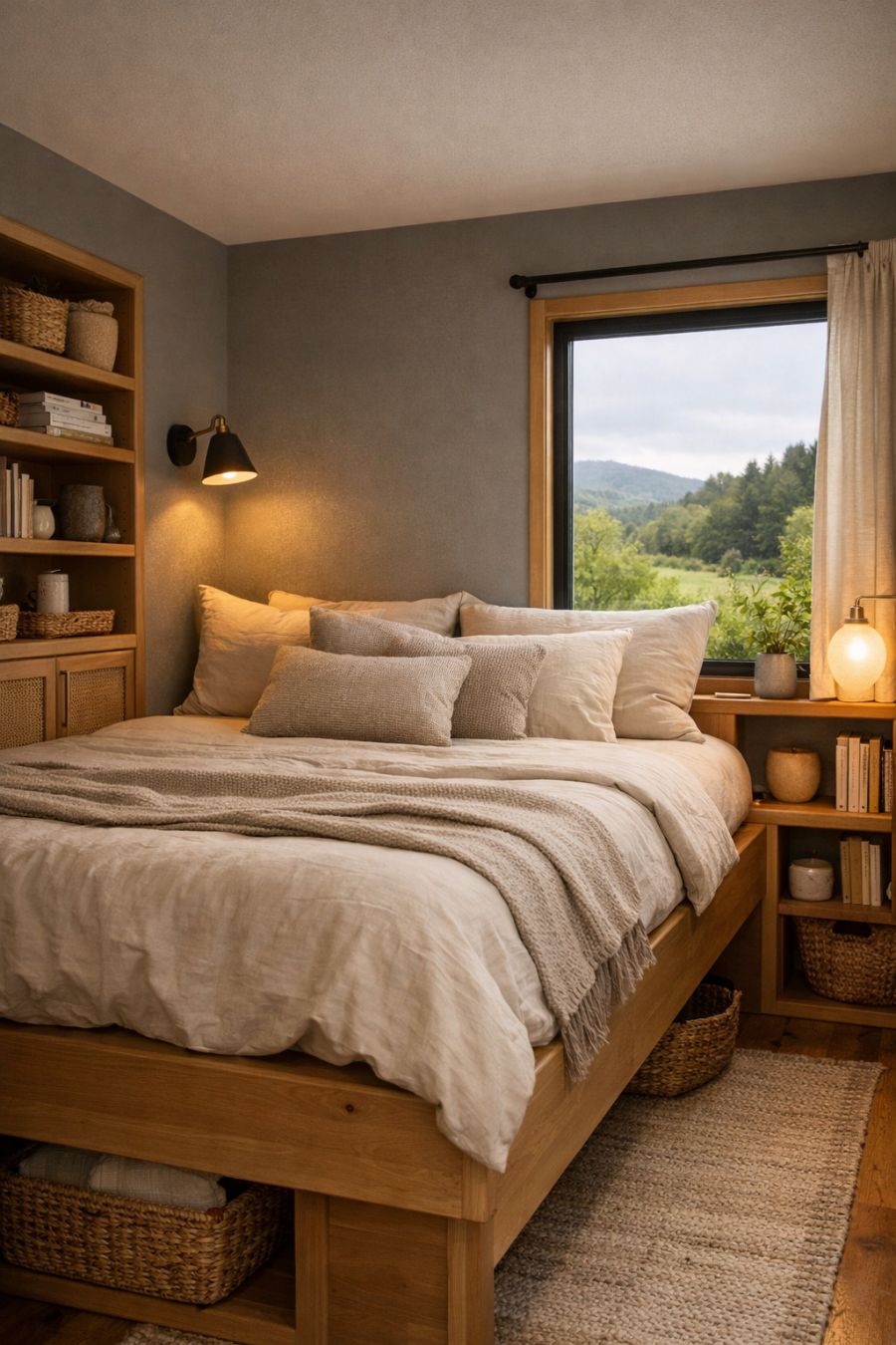 The bedroom offers a serene retreat, with design elements that prioritize comfort and tranquility. The focal point is a cozy platform bed, dressed in soft, neutral linens that invite relaxation. Built-in shelving provides storage without sacrificing space, and a large window offers a view of the surrounding landscape, bringing the outside in. The walls are painted in a calming shade of grey, creating a soothing atmosphere. Subtle lighting fixtures add warmth to the room, making it an ideal place to unwind after a long day.