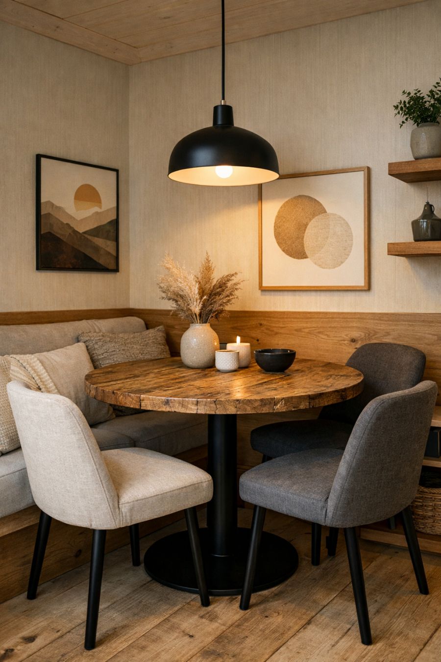 The dining area seamlessly integrates with the living space, creating a harmonious flow throughout the home. A small, round dining table, made from reclaimed wood, sits in the corner, surrounded by modern, upholstered chairs. Above the table, a contemporary pendant light hangs, casting a warm glow that makes the space inviting and intimate. The walls are adorned with minimalist artwork that reflects the home's overall design ethos, tying the space together with a sense of understated elegance.