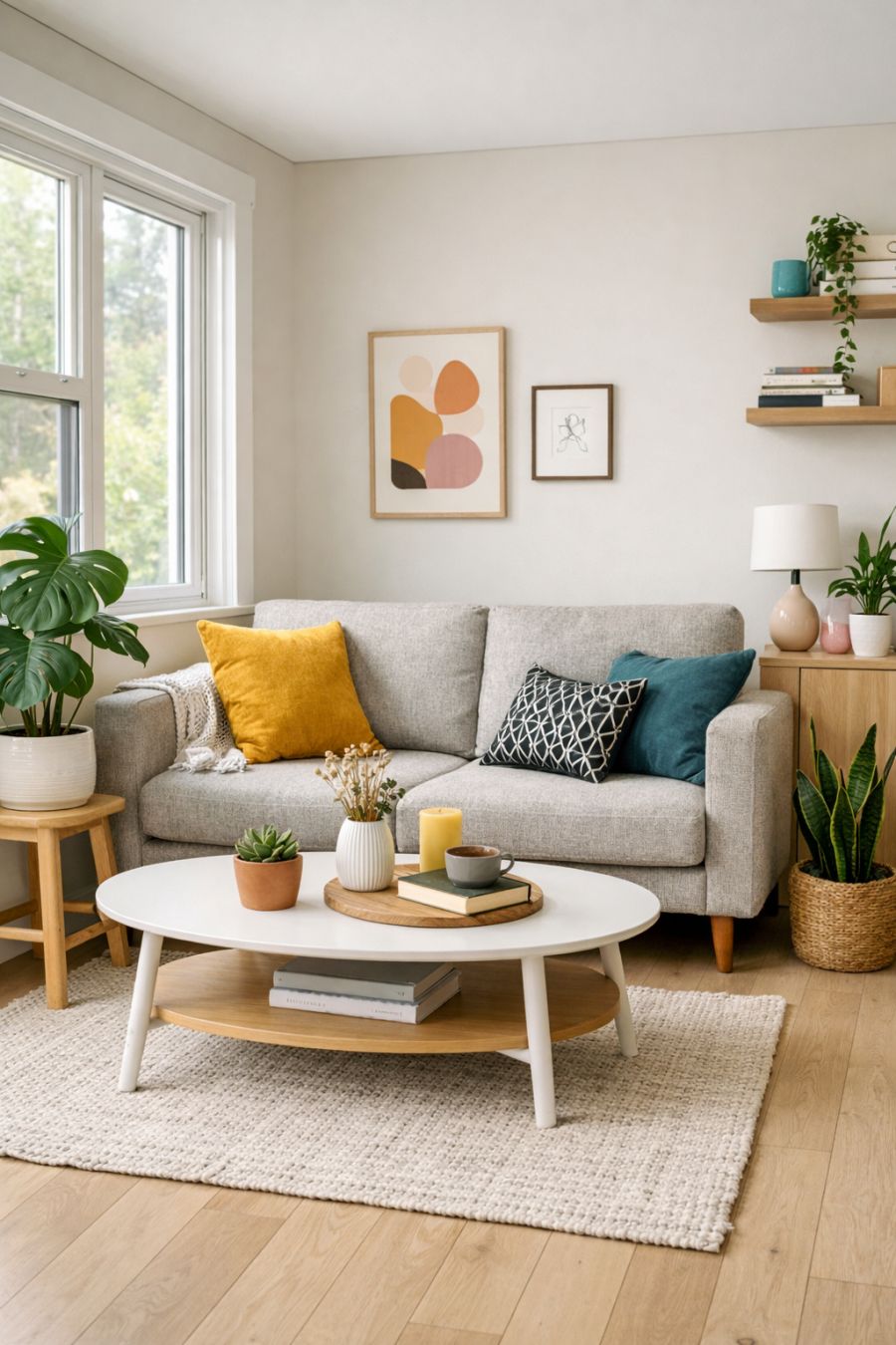 Stepping inside, the living area greets you with an open layout that maximizes the limited space. The interior design is a blend of Scandinavian simplicity and urban chic, featuring a neutral color palette with pops of color from carefully selected decor pieces. Large windows flood the room with natural light, enhancing the space's airy feel and highlighting the light wood flooring. A minimalist yet comfortable sofa anchors the room, complemented by a sleek coffee table and a few well-placed indoor plants that add a touch of greenery.