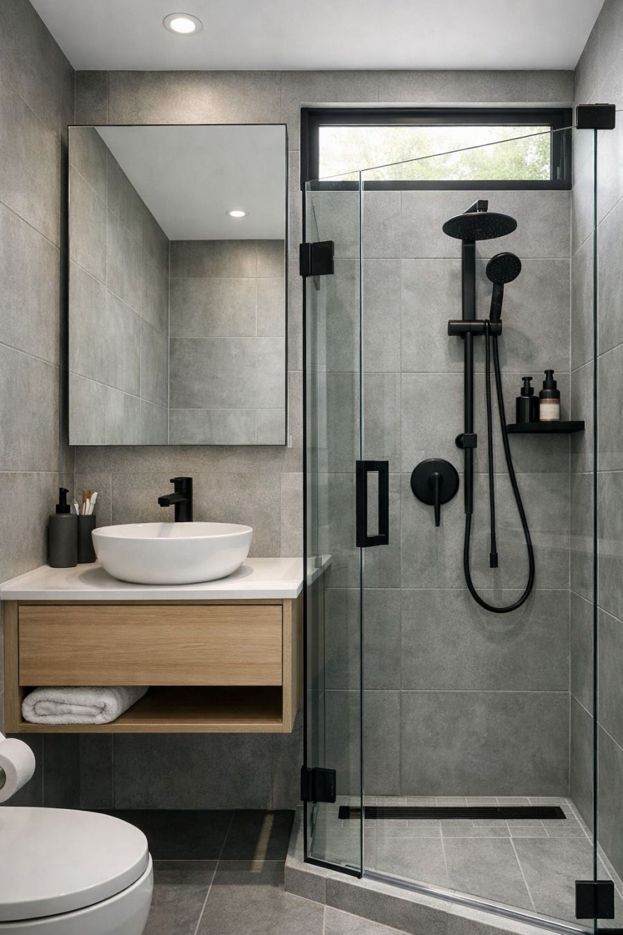 The bathroom is a marvel of compact design, combining functionality with modern aesthetics. It features a walk-in shower with a frameless glass door, accented by matte black fixtures that echo the home's exterior. The walls are finished with a sleek, grey tile, creating a cohesive look that is both stylish and easy to maintain. A wall-mounted vanity with a vessel sink saves space, while a large mirror enhances the room's sense of depth. Natural light filters in through a high window, ensuring the space feels bright and airy.