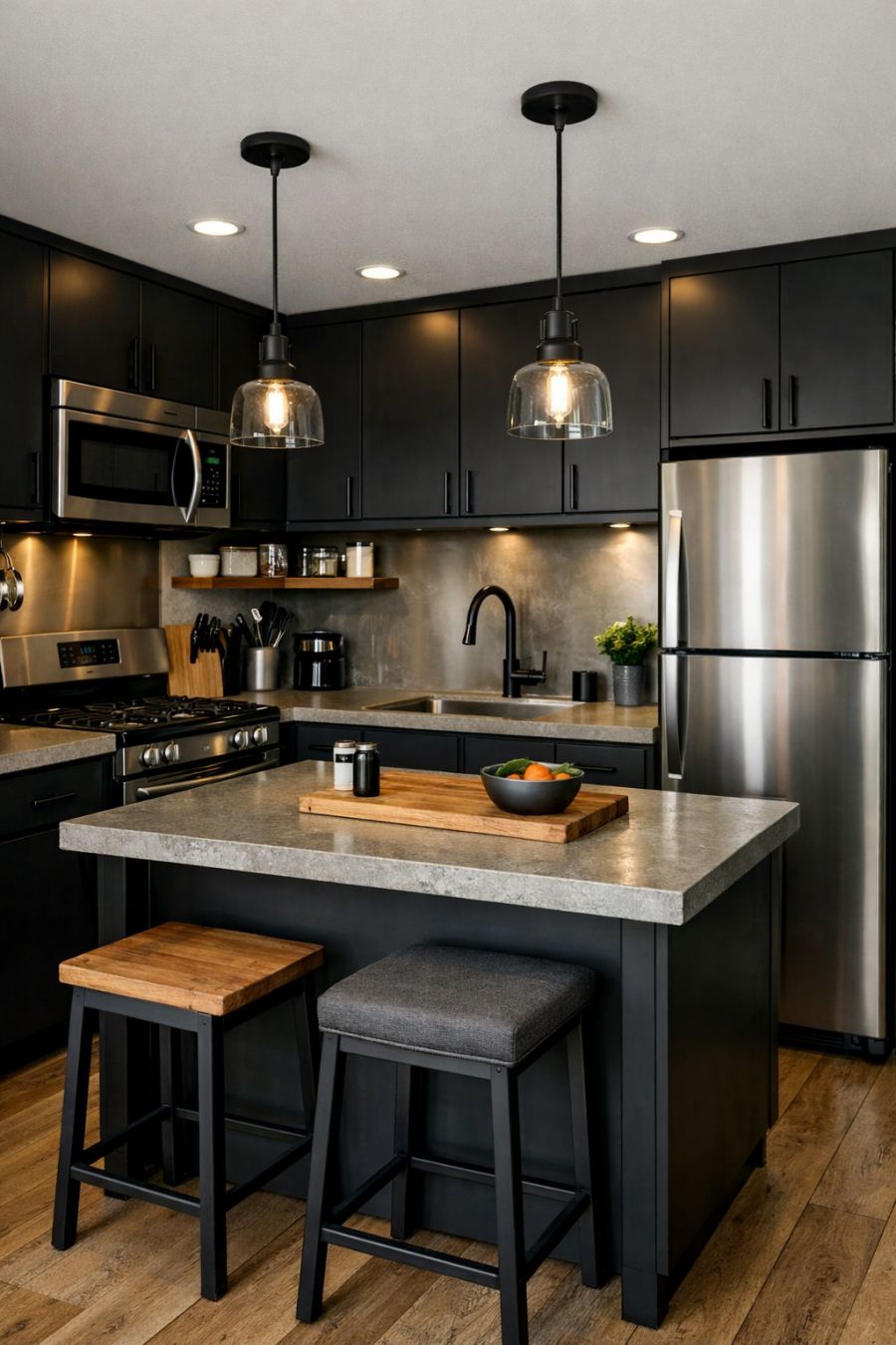 The kitchen is a testament to modern efficiency, packing all the essentials into a compact yet highly functional space. Sleek matte black cabinetry provides ample storage, while stainless steel appliances add a touch of industrial chic. The countertops are crafted from polished concrete, offering a durable and stylish workspace. A small kitchen island doubles as a breakfast bar, providing additional seating and serving as a focal point for casual gatherings. The design emphasizes clean lines and smart storage solutions, making the kitchen both practical and visually appealing.