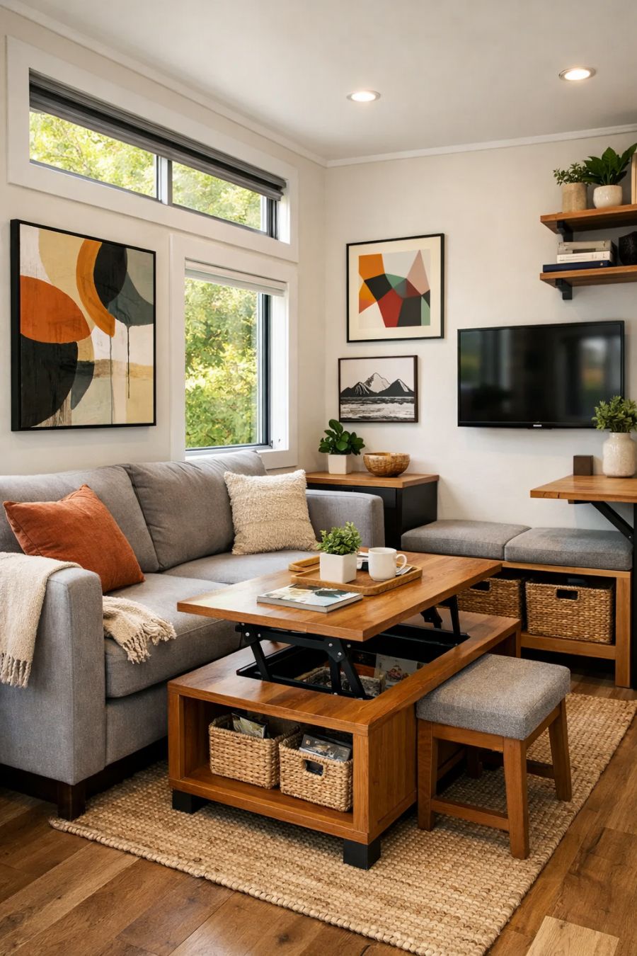 Upon entering, the living area greets you with an open and airy feel, thanks to its clever use of space and light. Large windows allow natural light to flood the room, highlighting the sleek modern furnishings. The walls are adorned with contemporary art pieces, adding personality and vibrancy to the space. A plush, compact sofa provides comfortable seating, while multi-functional furniture ensures that every square inch is utilized effectively, maintaining a sense of openness.