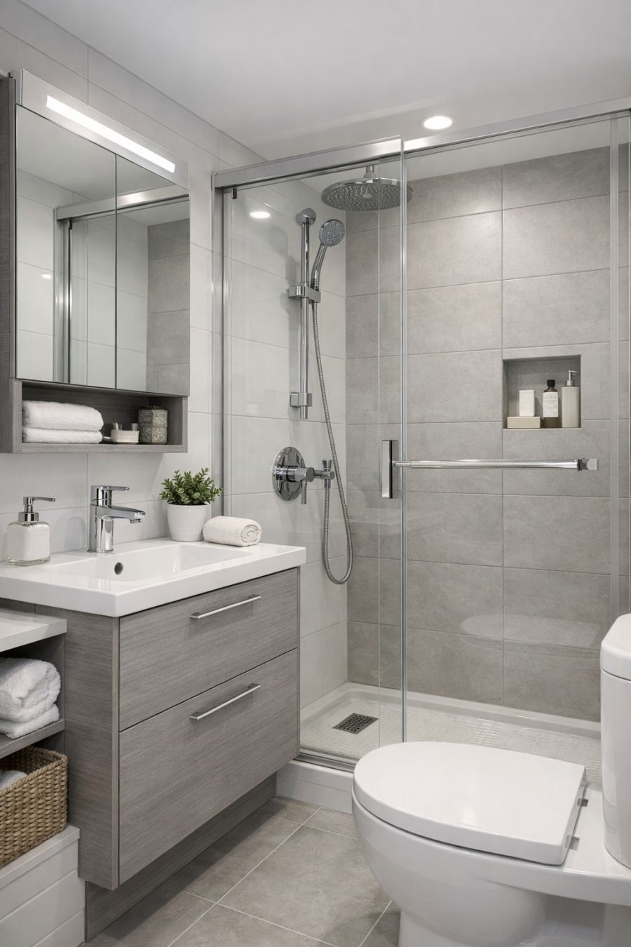 The bathroom, though compact, is a marvel of efficient design. High-quality materials such as ceramic tiles and chrome fixtures create a modern and clean aesthetic. The color scheme is neutral, with whites and grays providing a sense of openness. A compact yet luxurious shower maximizes the use of space, while a cleverly designed vanity offers storage without encroaching on the room's footprint. The overall atmosphere is one of serene functionality, where every element is thoughtfully chosen to enhance the user's experience.