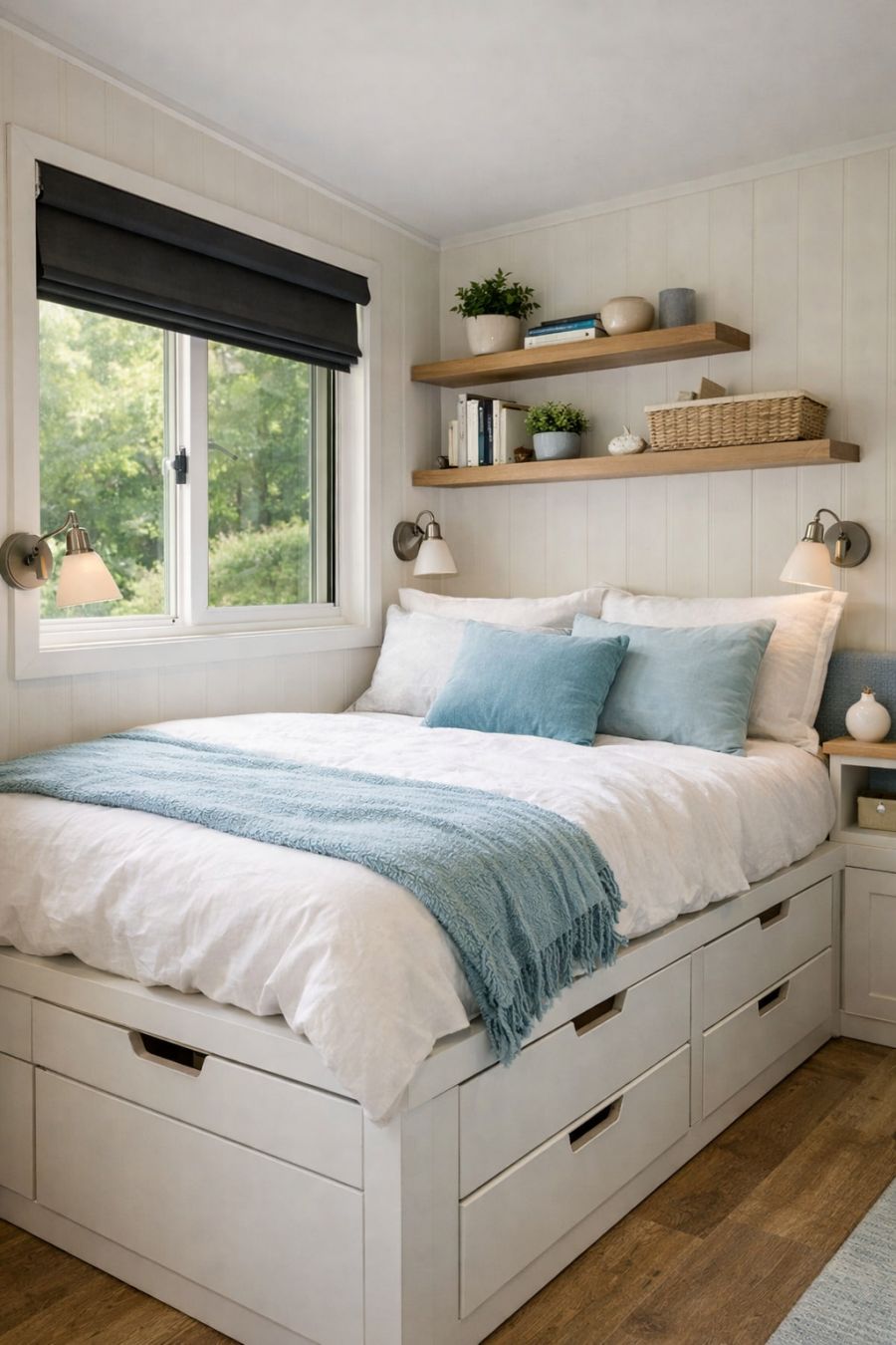 The bedroom is a sanctuary of calm, designed to maximize comfort and space. A built-in platform bed with ample storage underneath ensures that everything has its place, maintaining a clutter-free environment. The color palette is soothing, with soft blues and whites creating a restful atmosphere. Large windows offer a connection to the outdoors, with blackout blinds for privacy and restful sleep. Thoughtful touches, such as floating shelves and wall-mounted lighting, add to the functionality without sacrificing style.